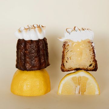 A classic canelé filled with a homemade strawberry jam, crowned with whipped cheesecake