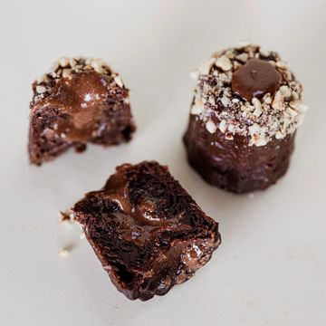 Decadent chocolate canelé filled with a velvety chocolate hazelnut butter, topped with a sprinkle of crushed, toasted hazelnuts, for that irresistible crunch.