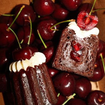 A chocolate based canelé filled with vibrant cherry jam, topped with light vanilla cream & delicate grated chocolate, finished with a fresh cherry.
