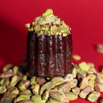 A chocolate based canelé filled with a pistachio cream, dipped in chocolate and crowned with crushed pistachios.